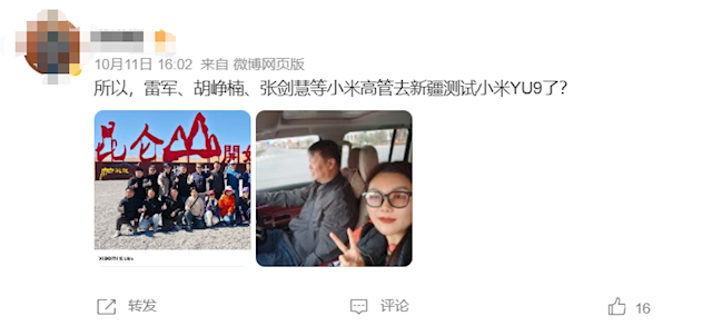 雷军晒的现场合照中,小米汽车高级顾问胡峥楠也在新疆参与测试。值得一提的是,10月9日,小米集团副总裁张剑慧曾预告 “节后有新任务” 并 @胡峥楠。