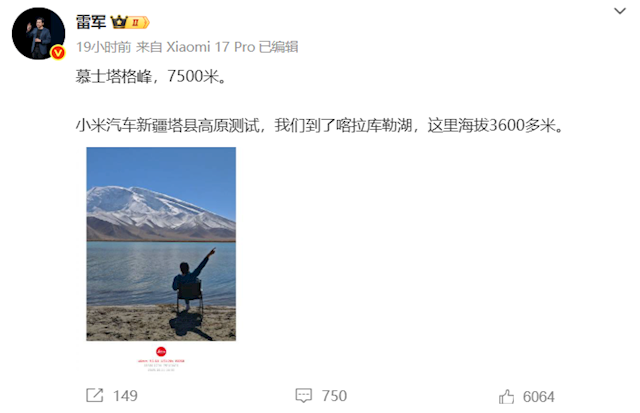 昨日14时50分,雷军发微博提到 “小米汽车新疆塔县高原测试”,称团队抵达海拔3600多米的喀什喀拉库勒湖,还晒了慕士塔格峰照片。