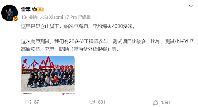 随后雷军补充,测试地在帕米尔高原,平均海拔4000多米,20 多位工程师参与,含小米YU7的高原续航、充电及防晒测试。