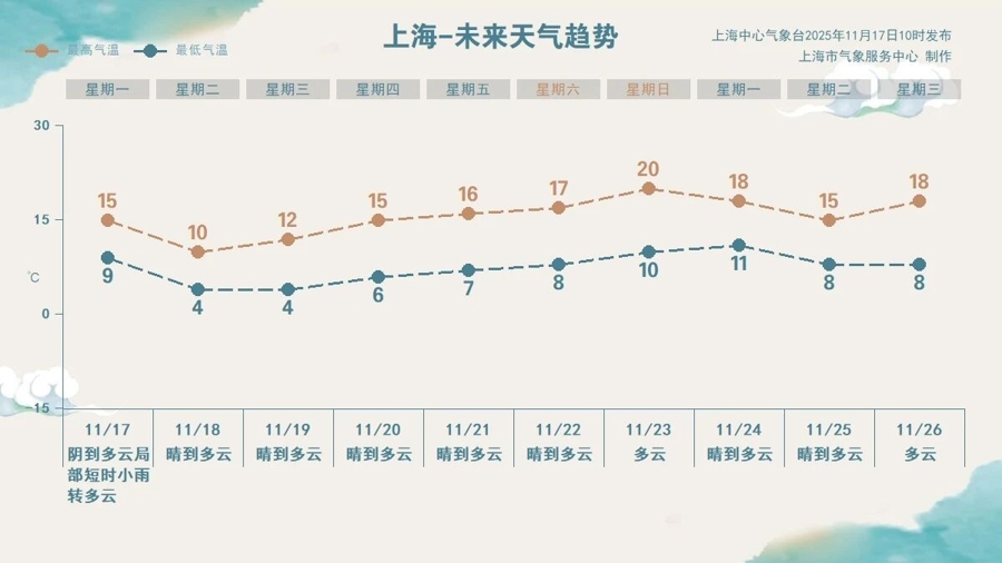 周三周四早晨气温将跌至是本轮降温的最低谷,届时中心城区最低气温只有4℃左右,郊区仅为0℃~2℃,局部有薄冰,大部郊区将出现初霜冻。周四冷空气影响趋于结束,气温逐日回升。