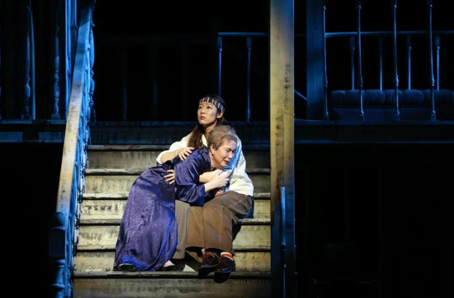 一座三层美式木质小楼静立于舞台中央,灰白冷调、高耸的阁楼,共同营造出压抑的氛围,与剧中“牢笼”的核心意象紧密呼应。虽是实景呈现,舞美设计申奥却未拘泥于现实主义手法,而是以立体而写意的笔触,将这座小楼如透视图般展开于观众眼前。